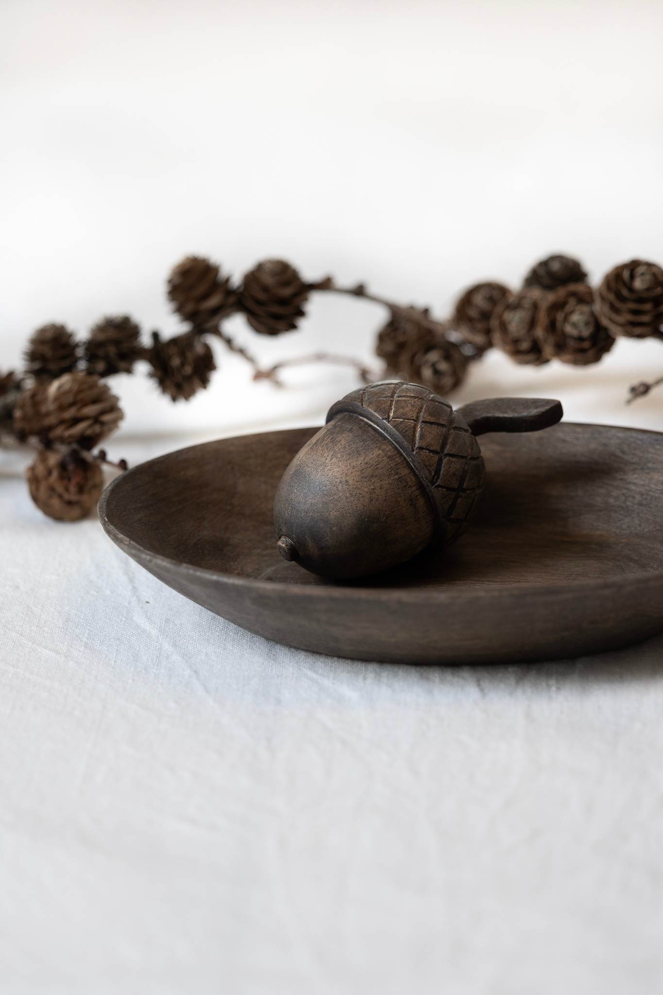 Håndlaget nøtt i brunt mangotre. Den er dekorativ alene, eller i grupper på fat og tablebooks. Lekker som bordpynt til alle julens festbord, og skal du gjøre ekstra stas på gjestene, kan hver tallerken dekoreres med en nøtt sammen med servitetten.