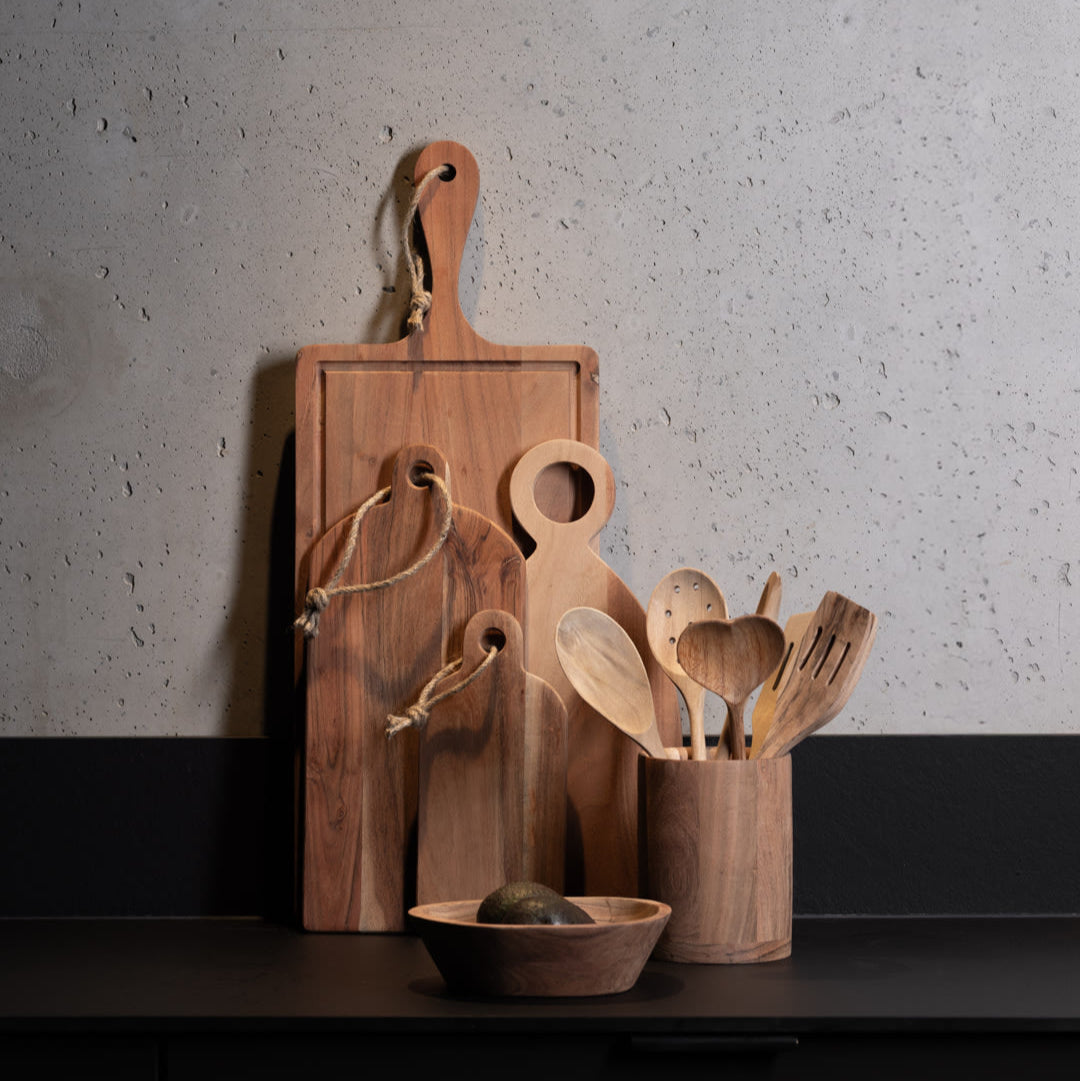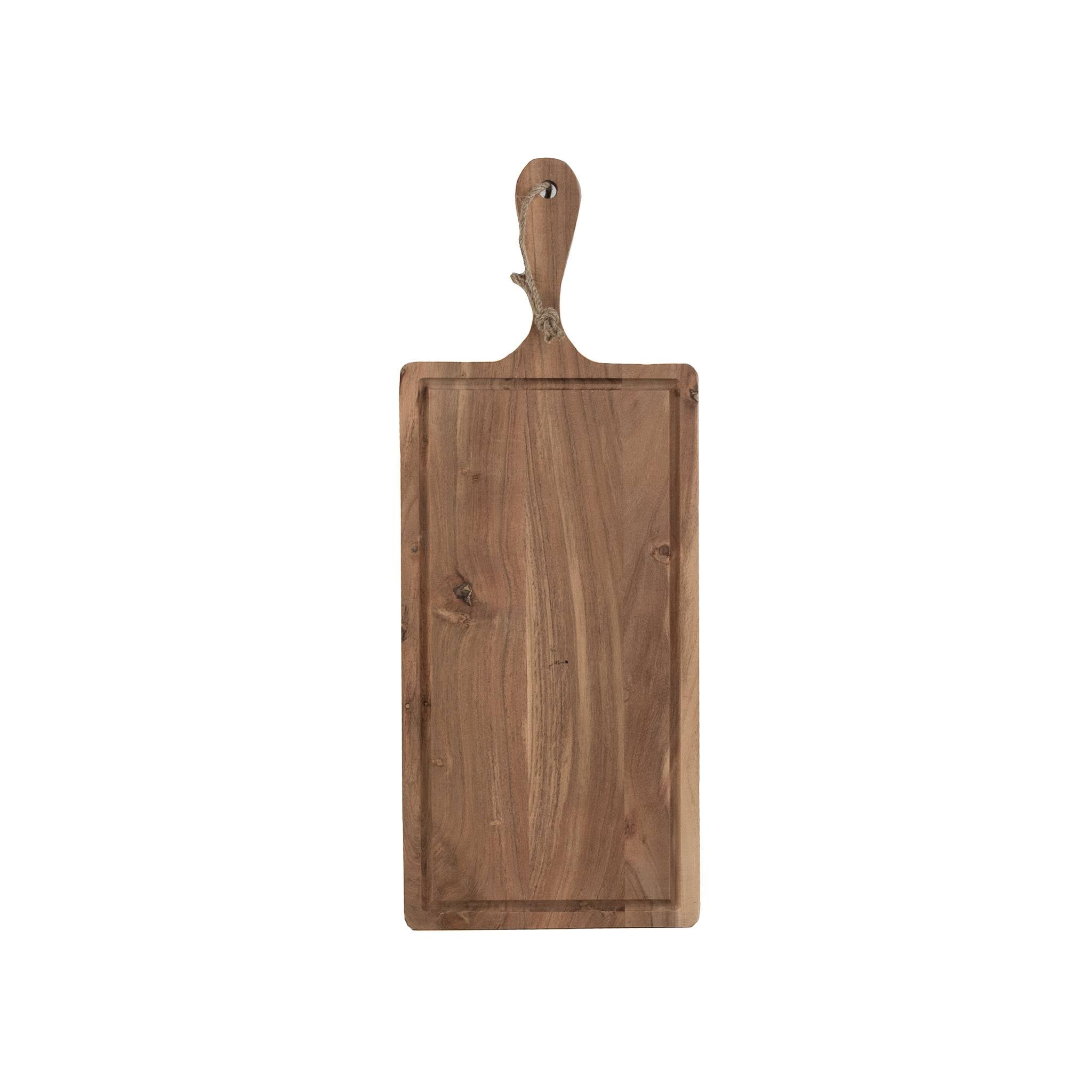 Large cutting board in acacia wood with juice groove. Perfect for cutting meat and fish as the juice won’t spill onto the counter. After use, rinse first in cold water before washing in warm running water. Regularly treat the cleaned board with neutral cooking oil to prevent moisture absorption.