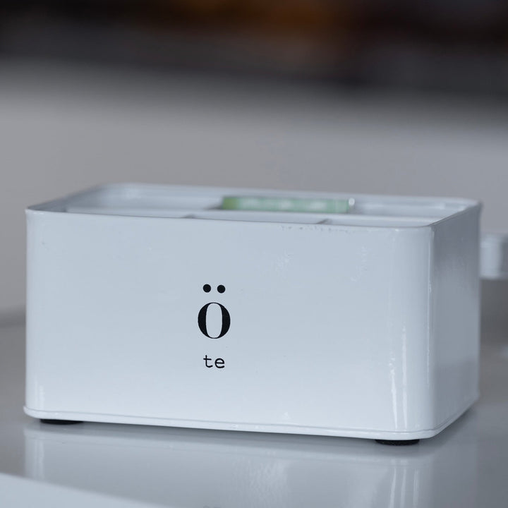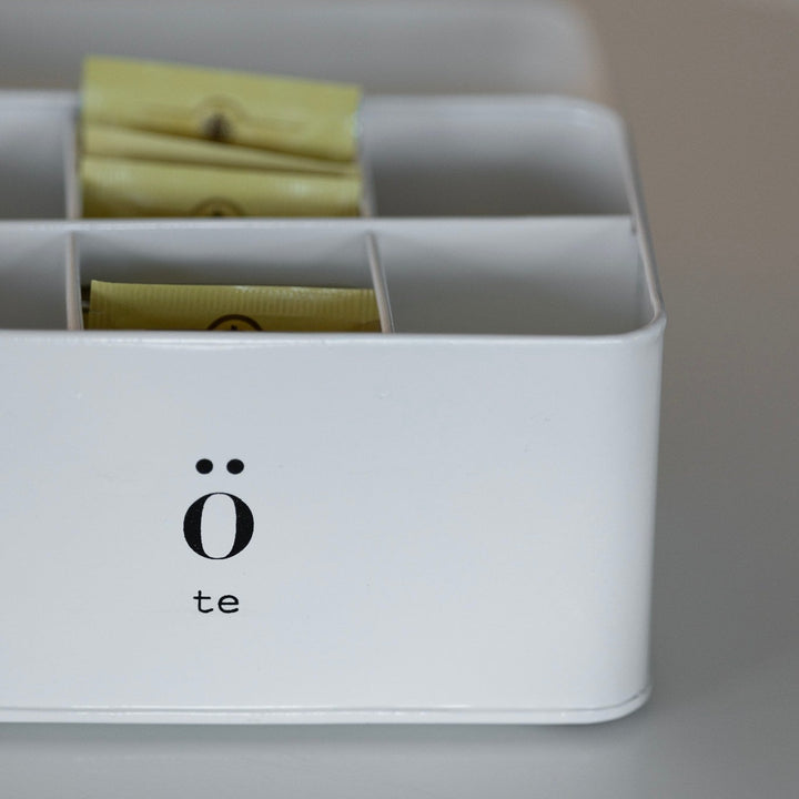 Stilren oppbevarings boks til te i hvitmalt emalje. Denne boksen er en del av en serie oppbevaring, som er så dekorativ at den gjerne kan stå framme og skape den gode stemningen vi ønsker oss. Håndvaskes og tørkes med koppehåndkle.