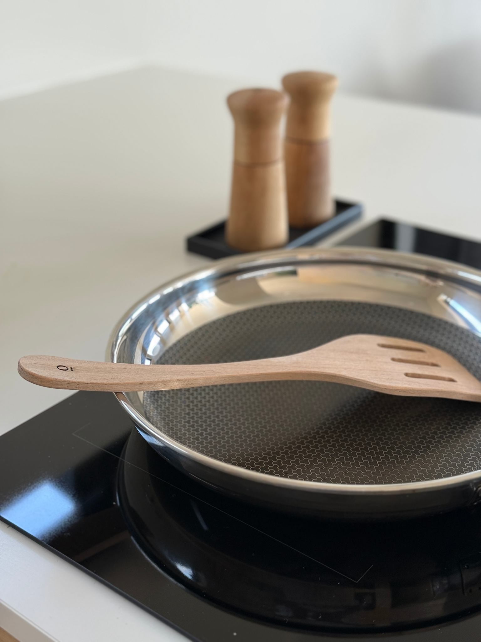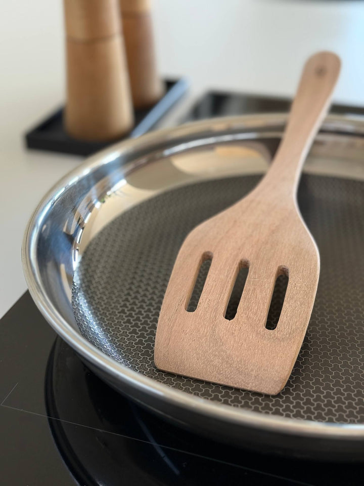 Spatula in acacia wood. When not in use, it is decorative in a jar on the countertop.